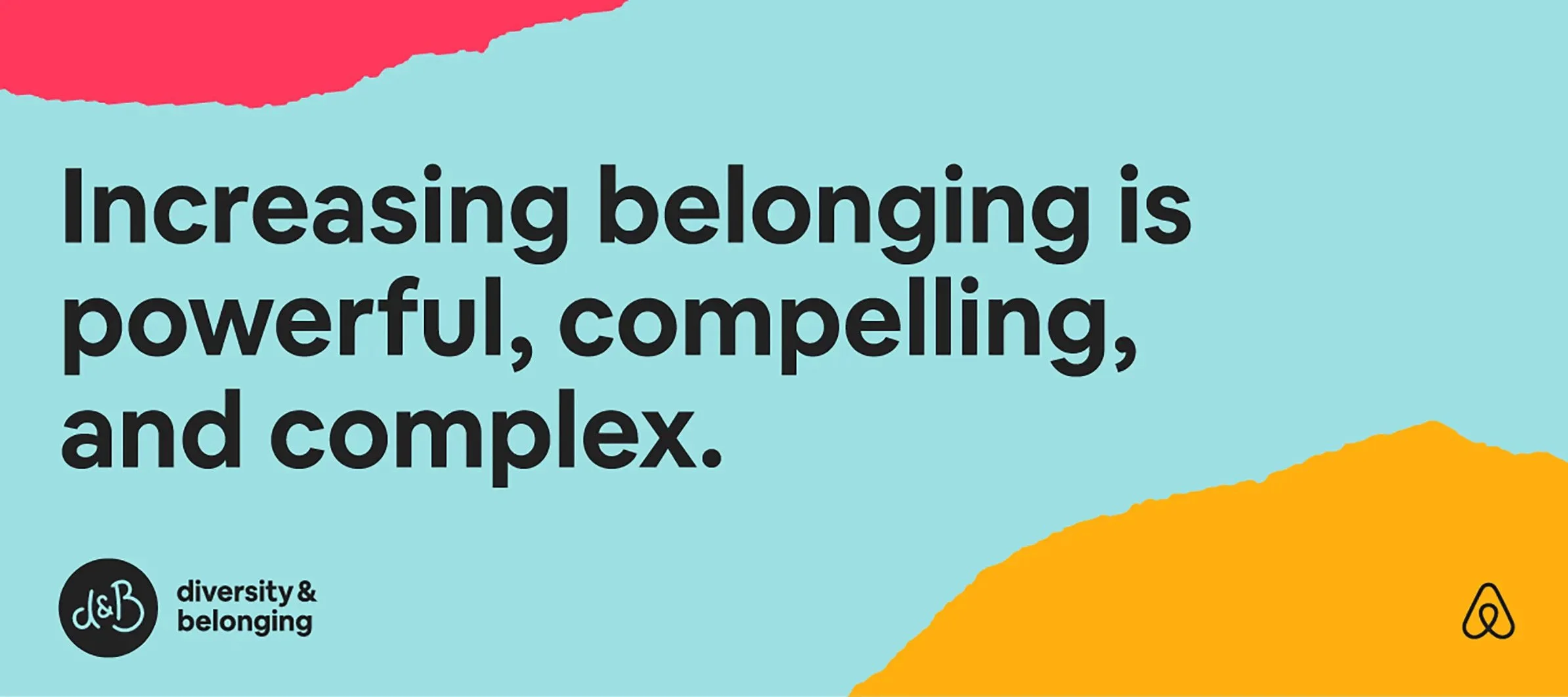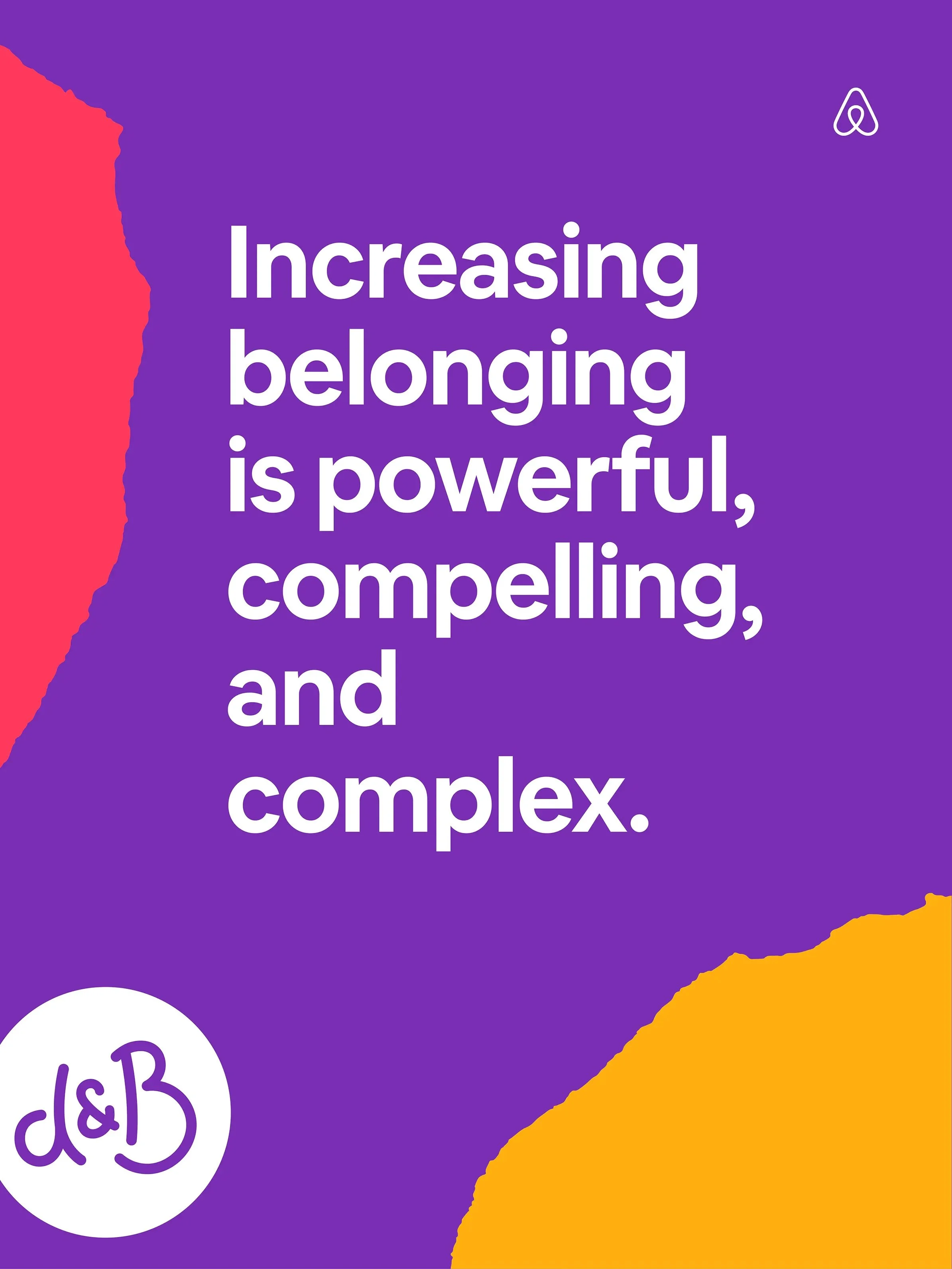 Our team was tasked to create an identity for the expanding Diversity and Belonging team at Airbnb. We developed a vibrant and human-centered system that is able to flex depending on the desired tone. Together, the logomark, palette, visual language, and typography, created a robust system that was applied to an array of different applications both for external and internal use.